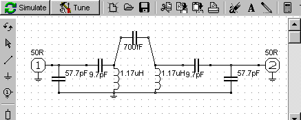 ich halt die Variable 1.0. Es werden L3 = 6,92 µH; L4 = 1,17 µH, C1 = 9,7 pF und C2 = 57,7 pF. Damit füttere ich die Simulation.