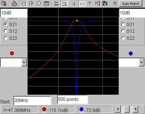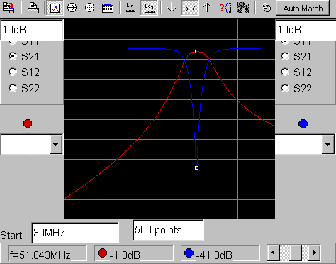 Zu erkennen ist der excellente Verlauf der Kurve. Einige Werte: Dämpfung s21 -53dB (30 MHz);