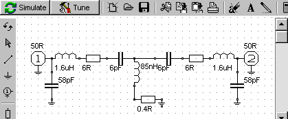 Es werden L1= 1,62 µH; L2 = 0,167 µH, C1 = 6 pF und C2 = 58 pF. Damit füttere ich die Simulation.
